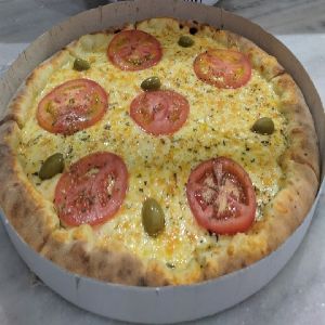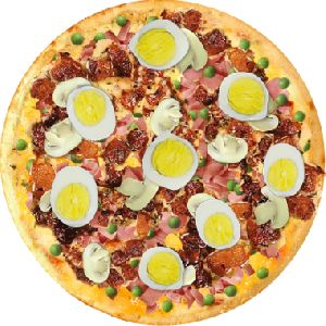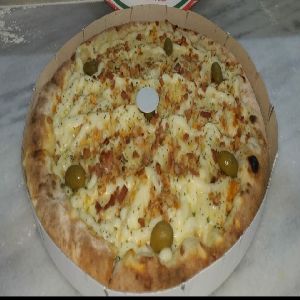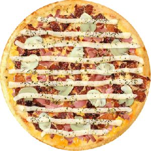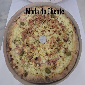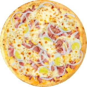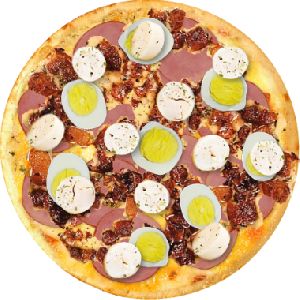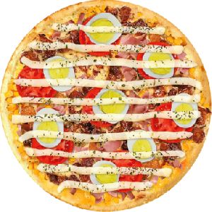 Presunto, mussarela, ervilha, palmito, bacon, ovos e cebola